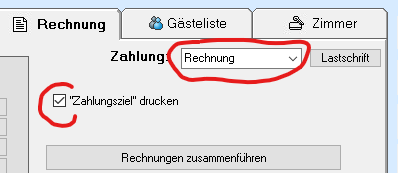 Um das Zahlungsziel auf die Rechnung zu bringen, muss die Zahlungsart „Rechnung“ gewählt sein und das Häkchen bei „Zahlungsziel drucken“ muss gesetzt sein: